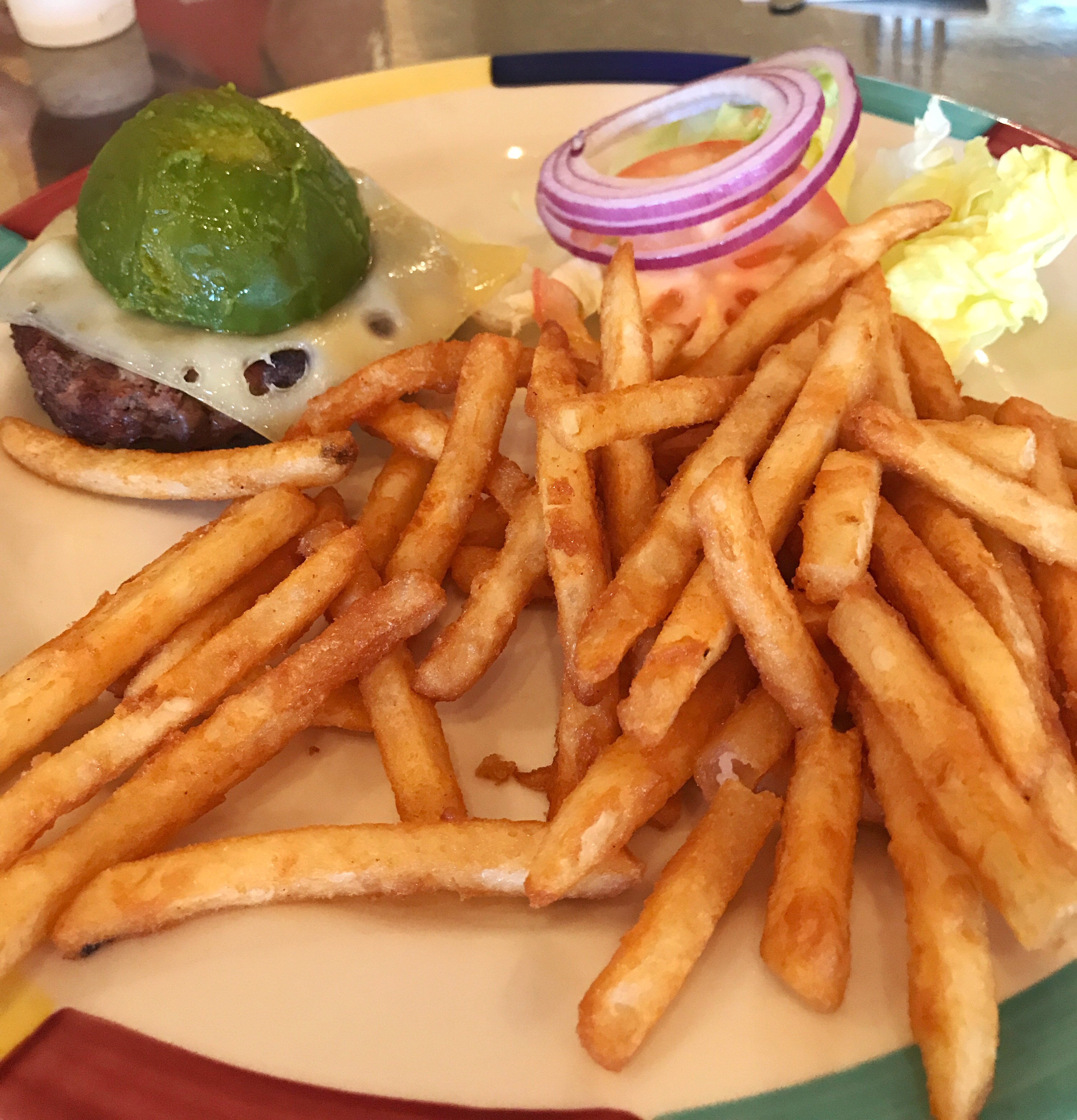 Pakko laittaa loppuun kuva tämänkin kävelyn jälkeisestä palauttavasta ateriasta. Tilasin gluteenittoman hampurilaisen ranskalaisilla. Näppärä ratkaisu tuo avokado!